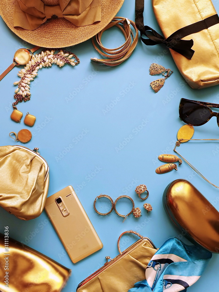 elegance Jewelry gold white pearl Luxury Glamour fashion costume jewelry cosmetics cases rings earrings bracelet red roses on blue and pink coral background women accessories