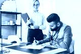 Secretary and Chief signs papers. A team of young businessmen working and communicating together in an office. Corporate businessteam and manager in a meeting.