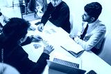 A team of young businessmen working and communicating together in an office. Corporate businessteam and manager in a meeting.