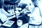 A team of young businessmen working and communicating together in an office. Corporate businessteam and manager in a meeting.