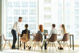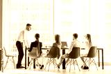 A team of young businessmen working and communicating together in an office. Corporate businessteam and manager in a meeting. desktop against the background of the pan window, free space for text