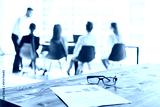 blurred photo in defocus. A team of young businessmen working and communicating together in an office. Corporate businessteam and manager in a meeting.