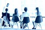 A team of young businessmen working and communicating together in an office. Corporate businessteam and manager in a meeting. desktop against the background of the pan window, free space for text