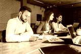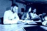 A team of young businessmen working and communicating together in an office. Corporate businessteam and manager in a meeting.