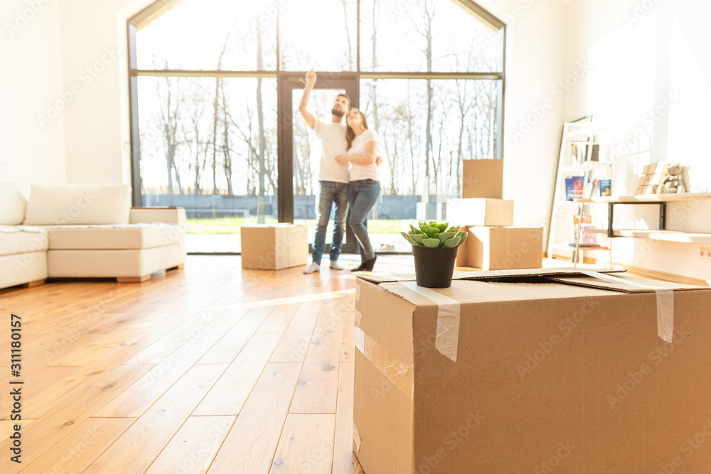young couple moves to a new home. the family carries boxes of things after buying a home.