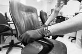 Young man in workwear and rubber gloves cleans the office chair with professional equipment.