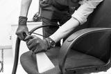 Young man in workwear and rubber gloves cleans the office chair with professional equipment.