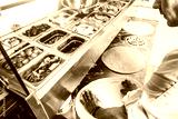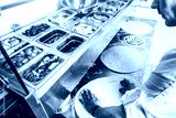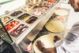 Professional chef cooking in the kitchen restaurant at the hotel, preparing dinner. A cook in an apron makes a salad of vegetables and pizza.