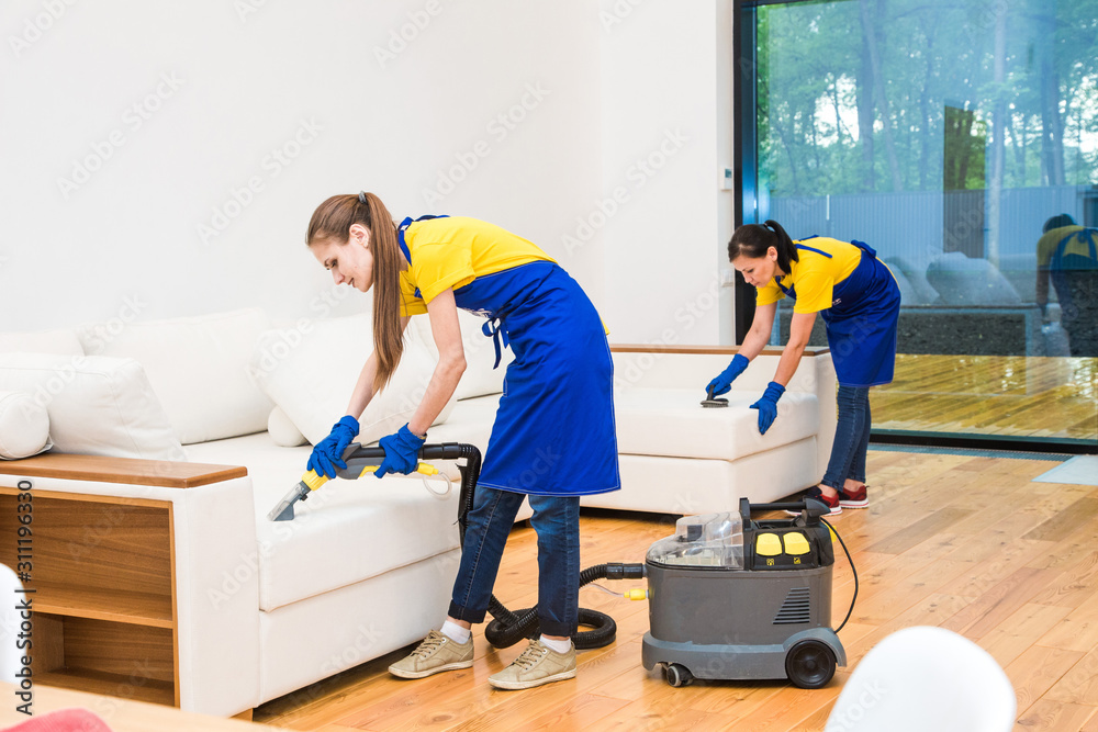 professional cleaning service. Two women in working uniform, in aprons. Two women in working uniform, in aprons, divide the cleaning of private house, cottage. Washing , vacuum cleaning the sofa