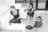 professional cleaning service. Two women in working uniform, in aprons. Two women in working uniform, in aprons, divide the cleaning of private house, cottage. Washing , vacuum cleaning the sofa