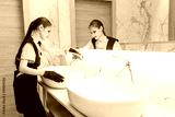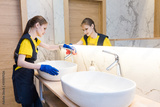 professional cleaning service. woman in uniform and gloves sponge washes the plumbing in the bathroom. Washing bath and sink