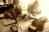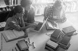 Group of female students study in the college library in the morning.Learning and preparing for exam.Educational concept.