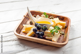 Plate with different types of cheese on white wood background