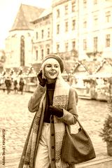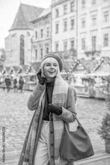 Happy smiling fashionable woman posing in street with festive winter fair. Model bearing trendy beige coat, scarf, beret, green turtleneck, white jeans, holding brown faux leather bag