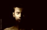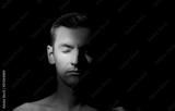 black and white dramatic portrait of a guy close-up on a black background with one light source