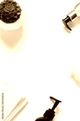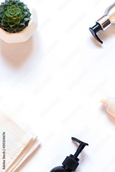 Beauty frame on the white background with cosmetic bottles and clean towels. Cleansing face or body concept top view. Copy space