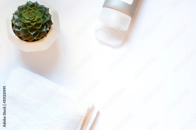 Beauty frame on the white background with cosmetic tube and clean towels. Cleansing face or body concept top view. Copy space