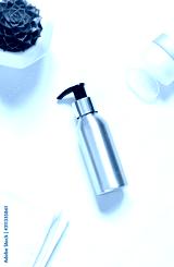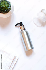 Beauty flat lay on the white background with cosmetic bottles and clean towels. Cleansing face or body concept top view.