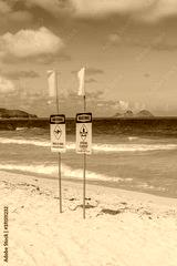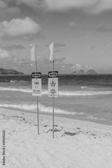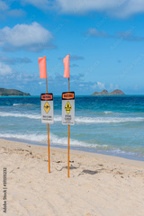 Man-o-war and strong current warning signs on Waimanalo Beach on Oahu, Hawaii