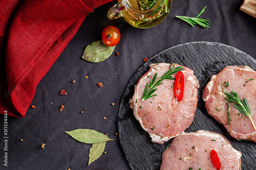 Semi-finished products. Marinated pork steak with rosemary and red chili for barbecue. Copy space, background image