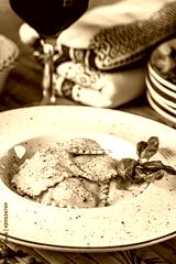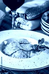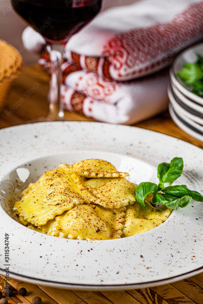 Italian food. Ravioli with feta cheese. Serving in a restaurant with Ukrainian style. Copy space, background image