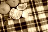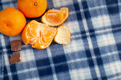 Book, tangerines and chocolate on a blue plaid, reading in silence, nobody