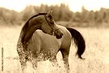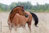 A chestnut arabian horse looking back against summer background. Portrait closeup.
