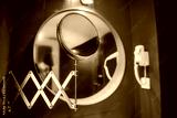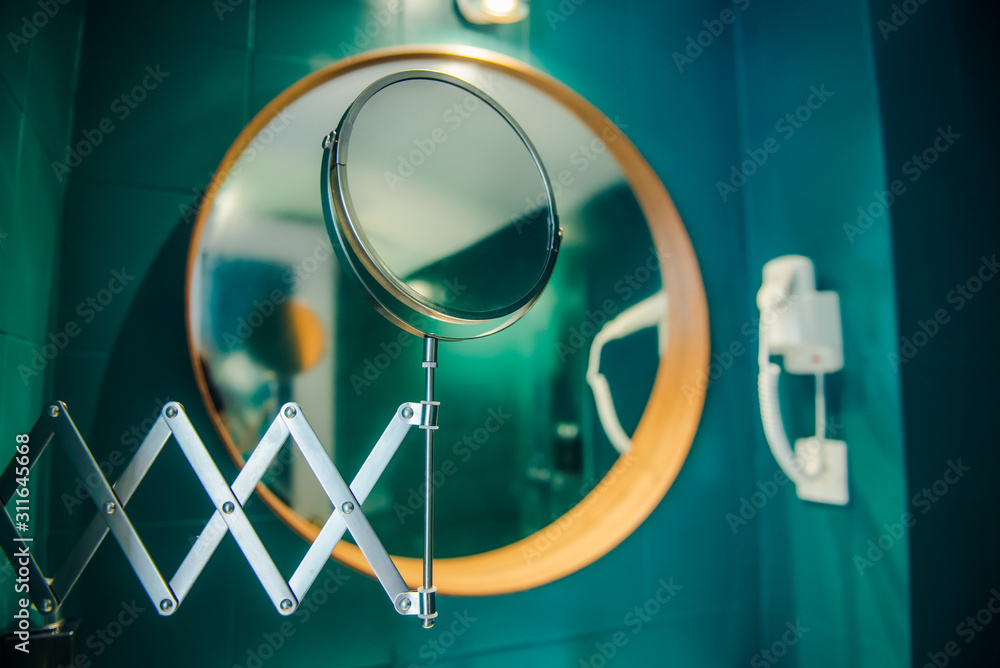 Two Round wall mirrors and small hair dryer for the bathroom. Close-up, selective focus. Copy space.