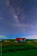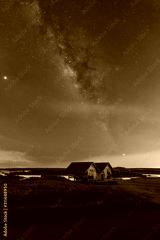 The night view with the Milky Way appearing above the pastures of the old hut.