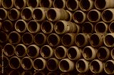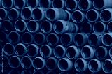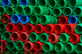 Used plastic barrels. Blue, green, and red plastic drum. Stacked of empty tank in food factory waiting for recycle and reuse. Container of raw material in food manufacturing industry. Old plastic drum