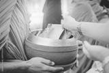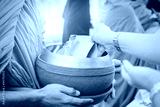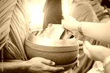 People give alms to buddhist monk when New year is coming. It is Asian traditional. Person offer food and put in monk alms bowl. People do good thing to create positive karma for themself, make merit
