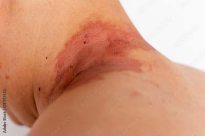 Close up allergy skin, swelled up, red rash, itchy. Asian guy get venoms of animals or Paederus dermatitis, Rove beetles bite him. He has a burning pain at skin on his neck, back. He get suffer, pain