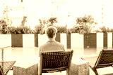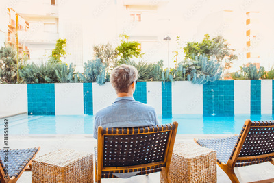 Back view young caucasian man in blue shirt relaxing on chair near swimming pool watching running water and plant flowebed. Summer, travel, vacation and holiday concept. Slow lifestyle. Copy space.