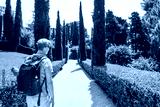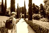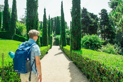 Back view young man making photo and video of green park location with stabilizer for compact action camera. Camera attached to a stick. New technology for travelers and bloggers. Devices for tourism