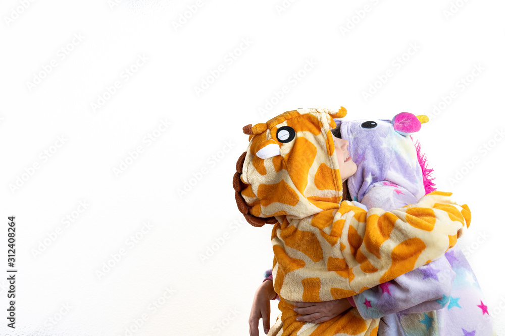 Cute children, boy and girl, brother in giraffe pajamas and sister in unicorn pajamas hug each other, isolated over white background, lovely family concept