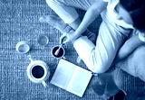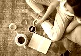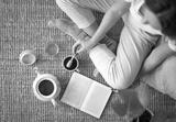 Girl with cup of coffee reading a book. Top view