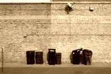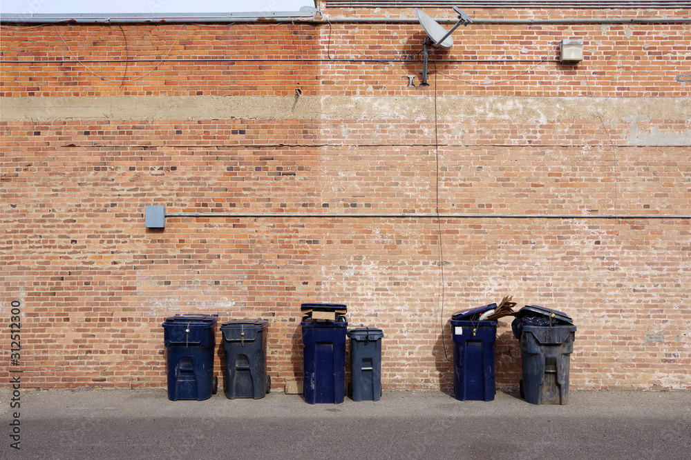 Close-up sectional full frame view of an old brick building side wall with a row of garbage bins