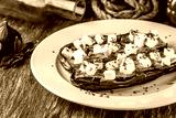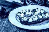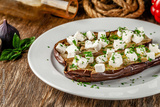 European cuisine. Baked eggplant with feta cheese and spices. Serving dishes in a restaurant on a white plate, on a wooden table. Background image. copy space