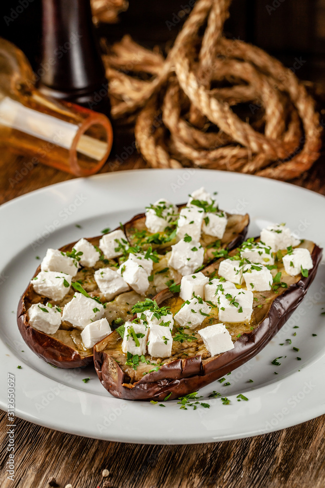 European cuisine. Baked eggplant with feta cheese and spices. Serving dishes in a restaurant on a white plate, on a wooden table. Background image. copy space
