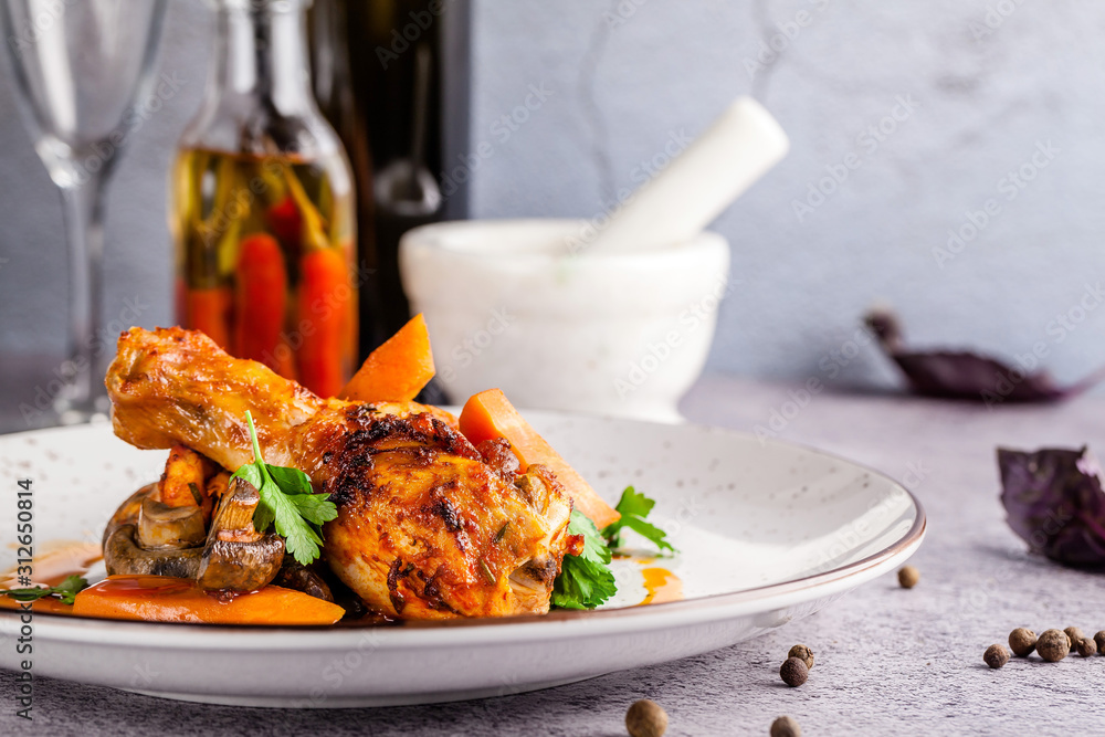 Spanish cuisine. Baked chicken legs with vegetables, mushrooms and carrots. Serving dishes in a restaurant on a white plate. Background image. copy space