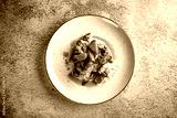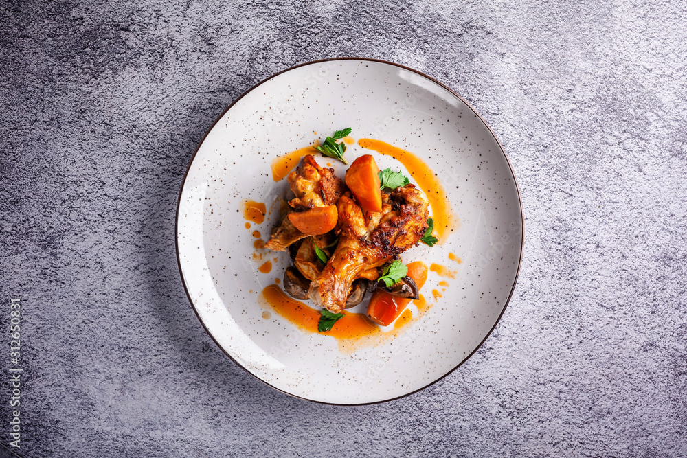 Spanish cuisine. Baked chicken legs with vegetables, mushrooms and carrots. Serving dishes in a restaurant on a white plate. Background image. copy space