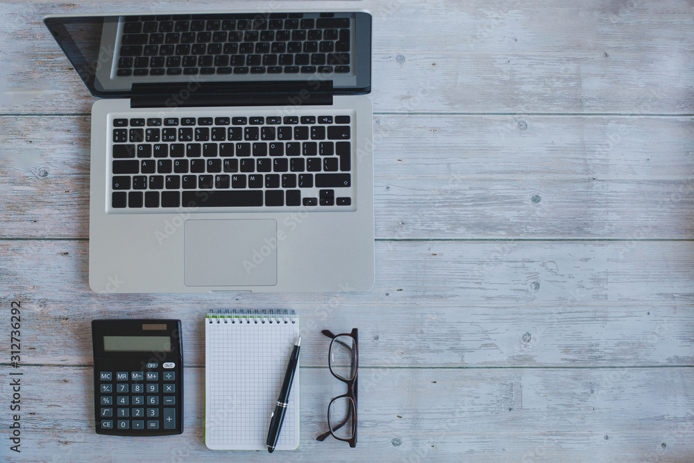 workplace, business and economy finance background, flatlay of laptop computer, calculator and notepad on wooden desk