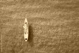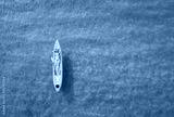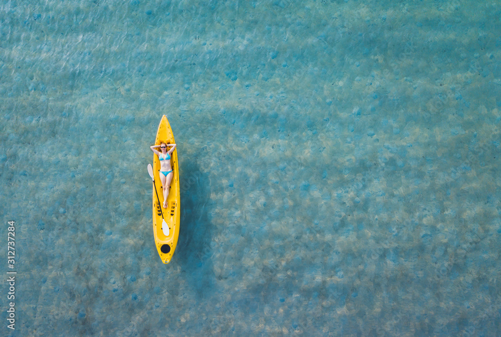 happy summer holidays on the beach, vacation travel, woman tourist in bikini relaxing on yellow kayak, aerial top view from above
