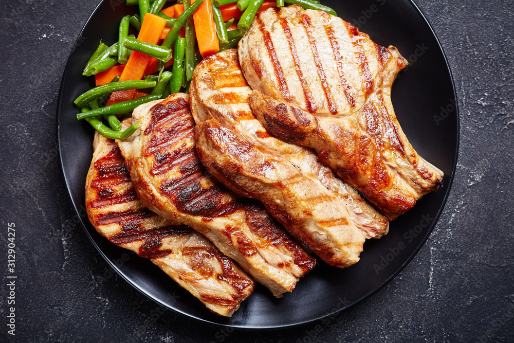 Grilled pork loin cutlets on a black plate
