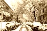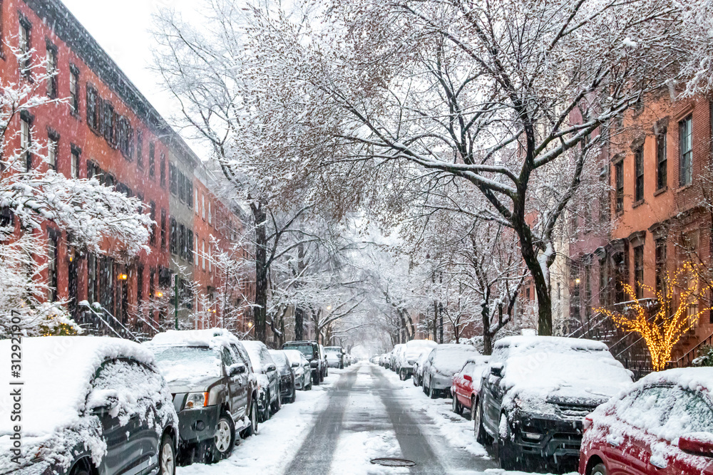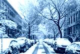 Snow covered street scene in the Greenwich Village neighborhood of New York City after a blizzard