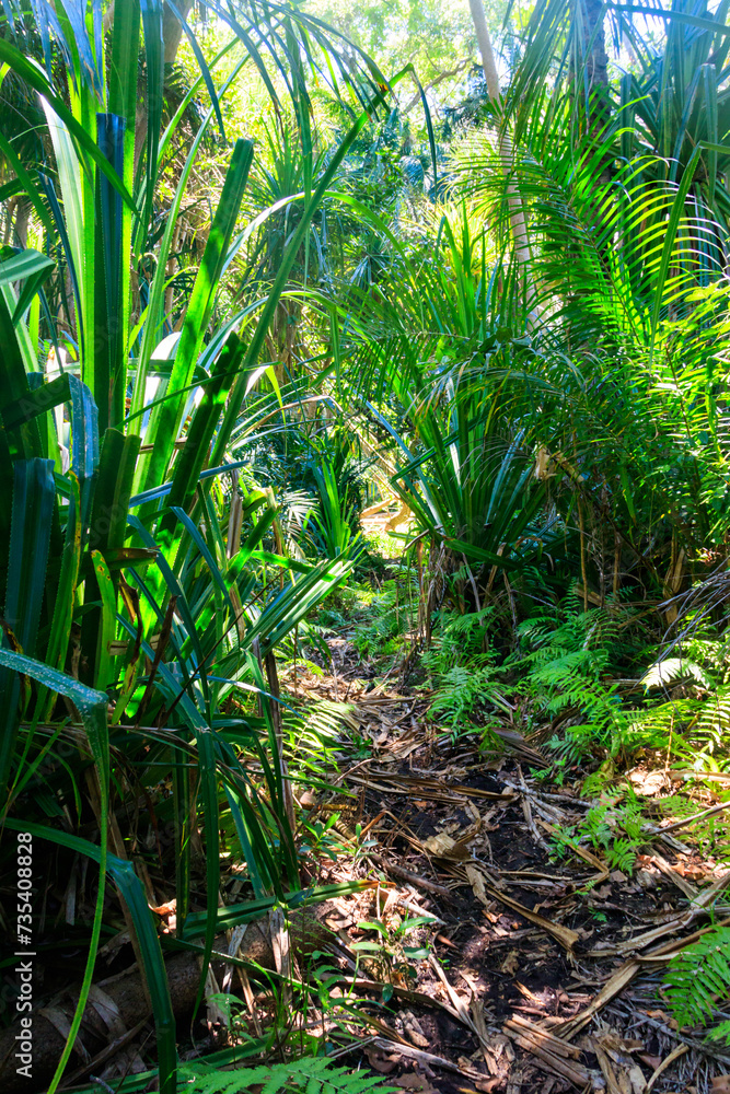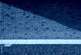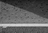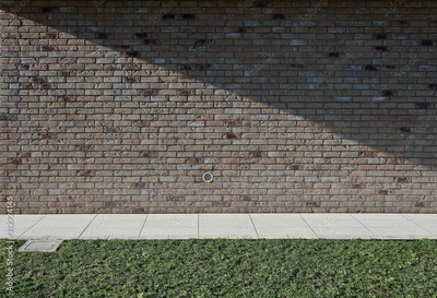 Modern brick wall divided obliquely by the shadow, a concrete footpath with a lawn in front. Background and texture