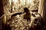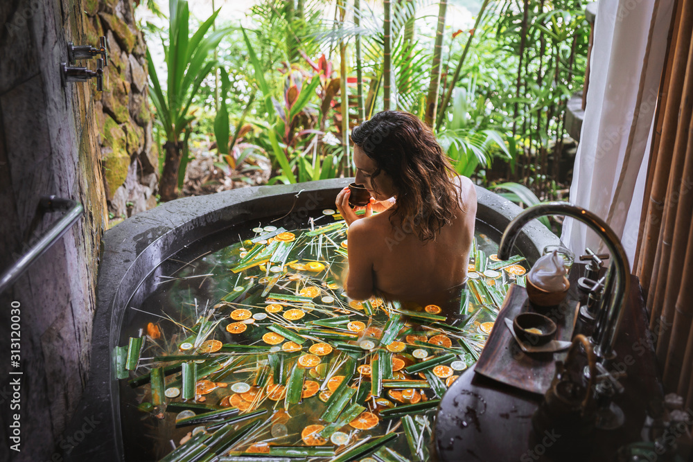 Young woman enjoying in outdoor luxury spa. Beautiful luxury stone bath tub with jungle view.Natural organic tropical ingredients in the water:ginger,lime,orange and sea salt. Beauty treatment concept