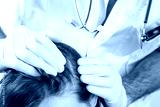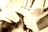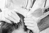 Doctor examining womans hair scalp, scalp eczema, dermatitis, psoriasis, hair loss, dandruff or dry scalp problem