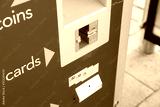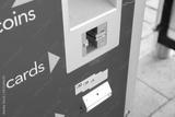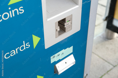 Newly installed smart, automated bus ticket machine located at a bus station. The slot is for for debit or credit cards, payment for a bus ticket.