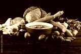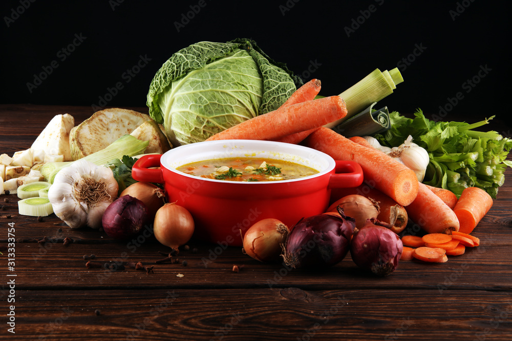 Broth with noodles and carrots, various fresh vegetables in a pot - colorful fresh clear spring soup. Rural kitchen scenery vegetarian bouillon stock